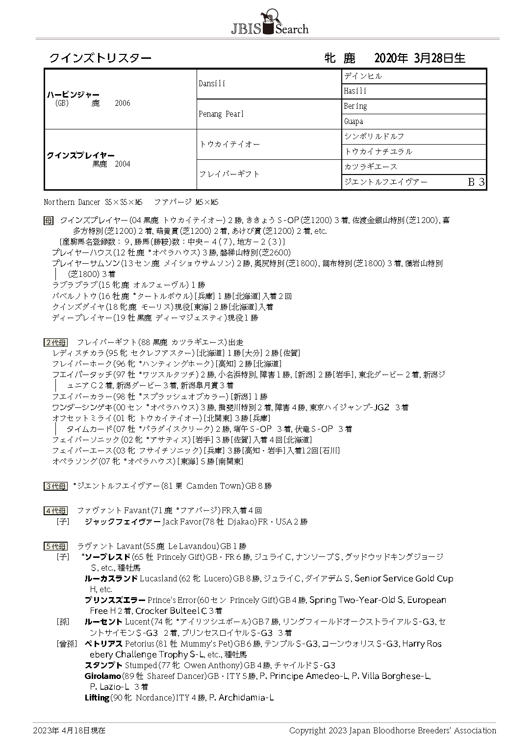 | 父:ハービンジャー 母:クインズプレイヤー 母の父:トウカイテイオー