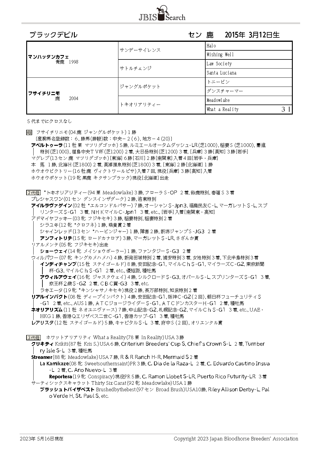 | 父:マンハッタンカフェ 母:フサイチリニモ 母の父:ジャングルポケット