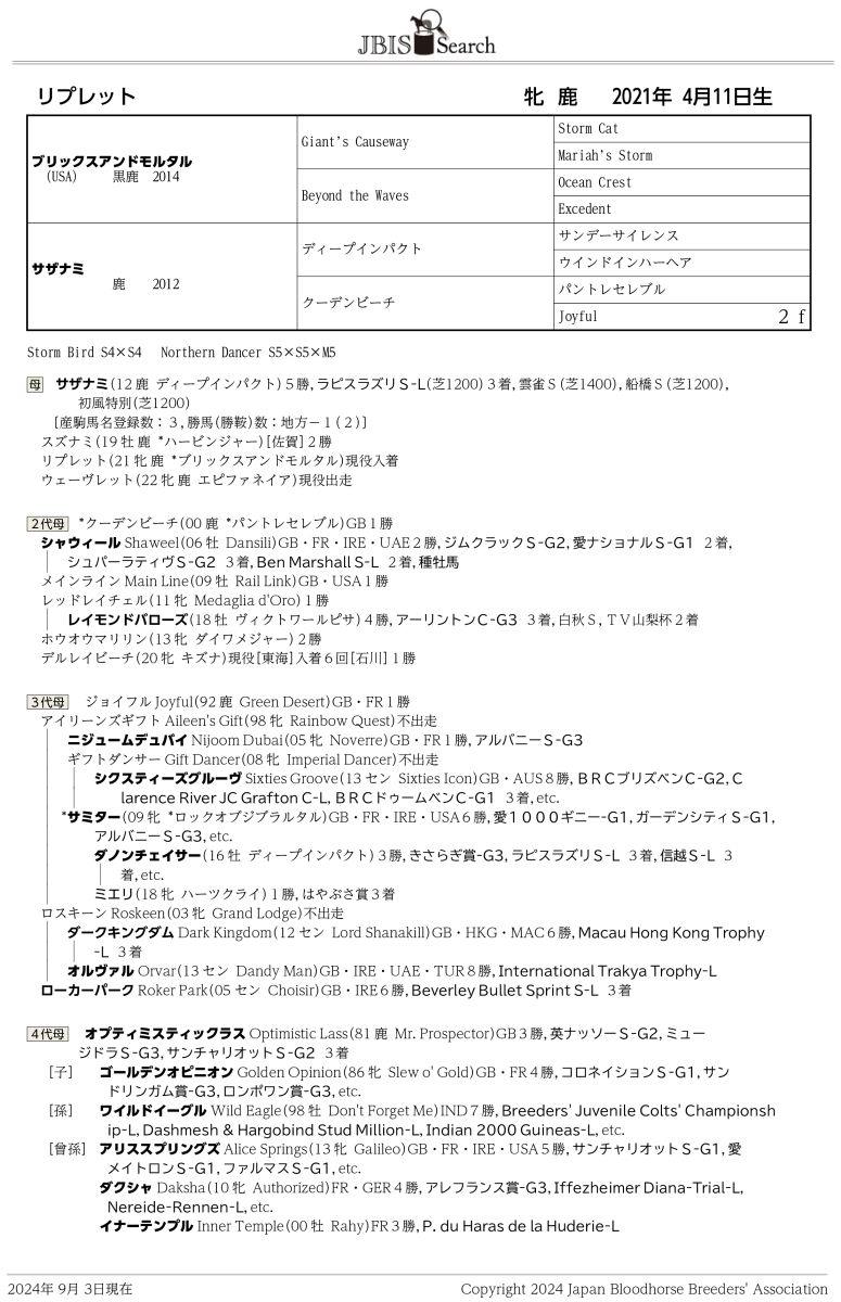 【入札時の注意事項】(必ずご確認ください) ※サラブレッドオークションでの落札馬は、原則として5日以内に在厩場所より引き渡しをさせていただきます。引き続き、飼養管理継続をご希望される場 合はオークション事務局までお問い合わせ下さい。 ※落札馬の引き渡しにかかる必要経費は、落札者様のご負担となります。 ※引き取り前に、現地での獣医検査を行うことを推奨いたします。出品馬の現況は、出品者による申告であり、引渡し時点での状況を保証している ものではありません。なお、この際の獣医検査にかかる費用は、落札者様のご負担となります。 ※実馬を見学いただくことが可能です。事前に申し込みが必要ですので、ご希望の方はオークション事務局までお問い合わせ下さい。 |