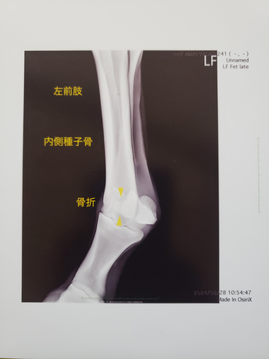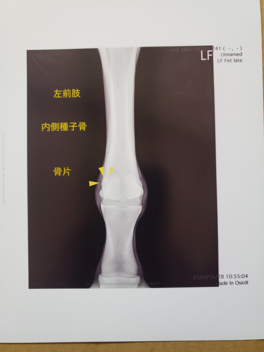 なお、レントゲン上では、左前肢内側種子骨に骨折・骨片が見られますが、現状においては歩様の乱れ、及びハリ感等はありません。現状をご理解いただいた上でのご検討、ご入札をお願いいたします。