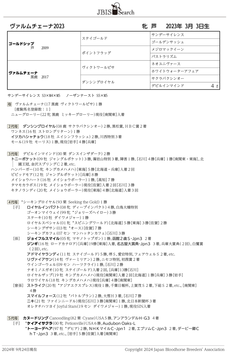一方、母系を見ますと、母ヴァルムチェーナは札幌のダート1000mで1勝、祖母ダンシングロイヤルは2連勝で黒松賞を勝ち、1000万クラスでも善戦しました。おじのイツカハシャチョウは阪神のダート1800mで2勝、近親トニーポケットは中央平地3勝、金沢の重賞を制しています。4代母シーキングロイヤルの半弟にはNHKマイルC2着のトーヨーデヘアが存在。函館2歳S2着のジョイフルスマイルや中央5勝のオープン馬アドマイヤランディ、兵庫の重賞11勝を誇るジンギ(名古屋大賞典3着)らもこのファミリーの出身です。
