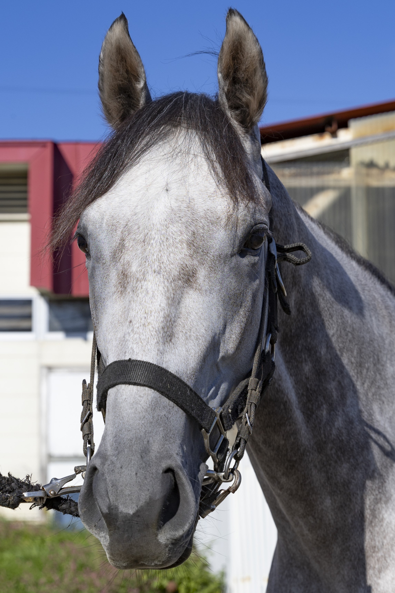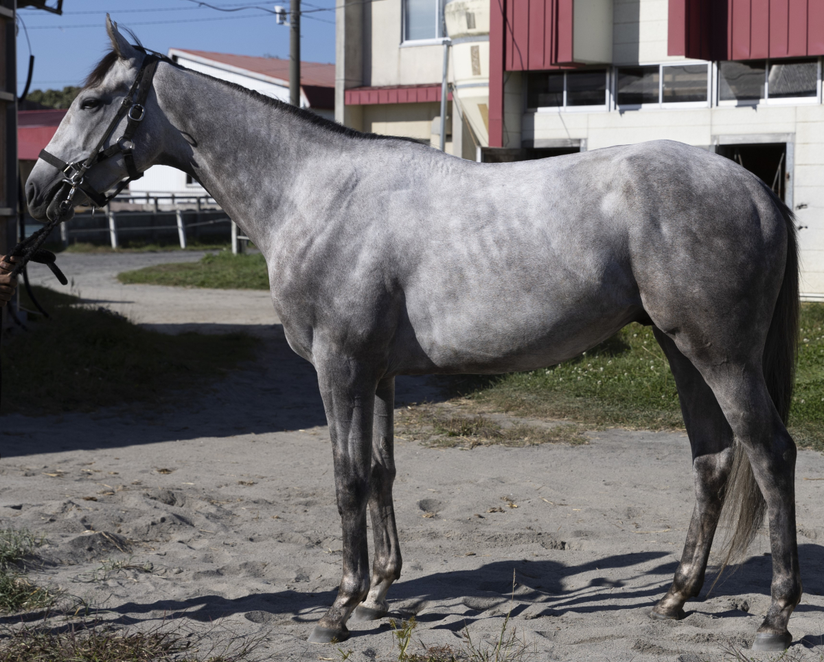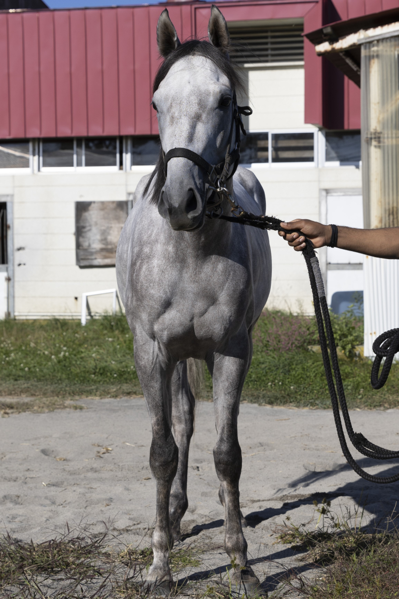 本馬は未出走。ホッカイドウ競馬デビューに向け調教を進めてきました。入厩当初は怖がりな性格で、調教でも横に跳ねたり環境に慣れるまで時間を要しました。環境に慣れ精神的に余裕が出て自我を出し始めると、非常に馬っけが強くなり、ゲート練習では1頭の練習はできるものの、両サイドに馬が入ると馬っけが酷くなってしまい、ゲート試験までも行けない状況とのことで去勢手術の提案もありましたが、手術は実施せず、頭数整理の為オークション出品の流れとなりました。調教の動きはホッカイドウ競馬のレベルに入っても水準級の動きは感じられ、血統的にも秘めるポテンシャルは高いと思われます。現状は気性面のウィークポイントが先行していますが、心身の成長を待てば、活躍できる可能性は秘めていると思います。現状確認の上、ノークレームノーリターンでの出品となります。ご検討のほど宜しくお願い致します。