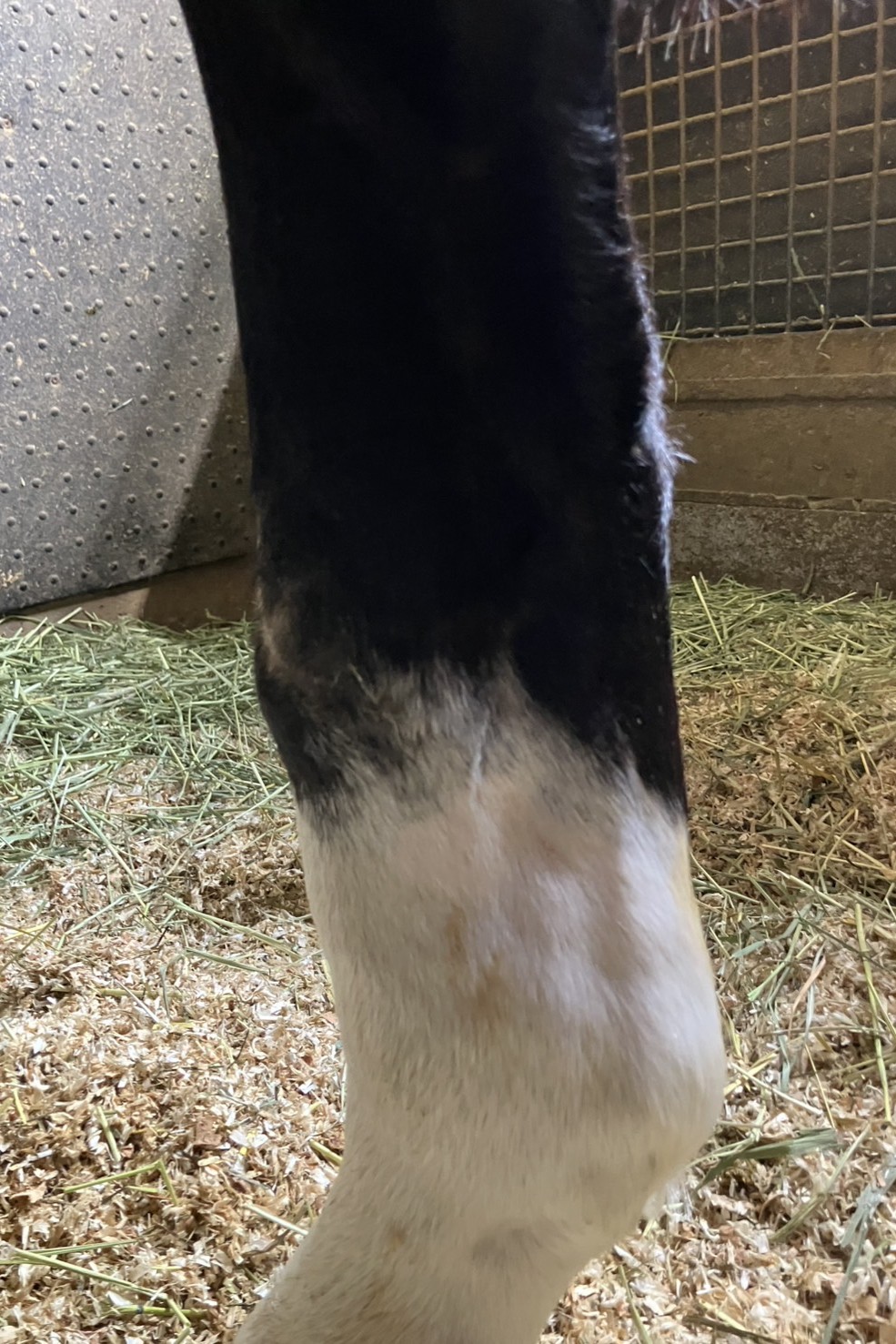 なお、本馬は2022年9月に調教中のアクシデントで右後肢管部前面に深い傷を負い、長趾伸筋腱の修復手術を行ったため歪な形をしています。この傷の治癒までに5カ月程度かかりましたが、運動への影響は見られていません。添付の写真を、ご確認ください。