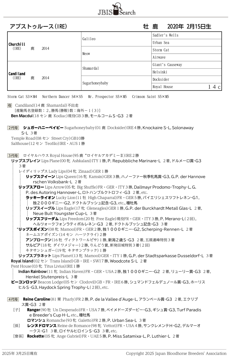 本馬の半兄Ben Macdui (IRE) はモールコームS (G3) 2着に入着した実績の持ち主です。また、2代母Sugarhoneybaby (IRE) はリステッド競走勝ち馬、そして、3代母Royal House (FR) から広がるファミリーには、独1000ギニー (G2) の勝ち馬リップスポイズン (GER)、新潟2歳S (G3) 2着のアンブロークン、バイエリシェスツフトレネン (G1) 勝ち馬のLucky Lion (GB) など、活躍馬が名を連ねています。
