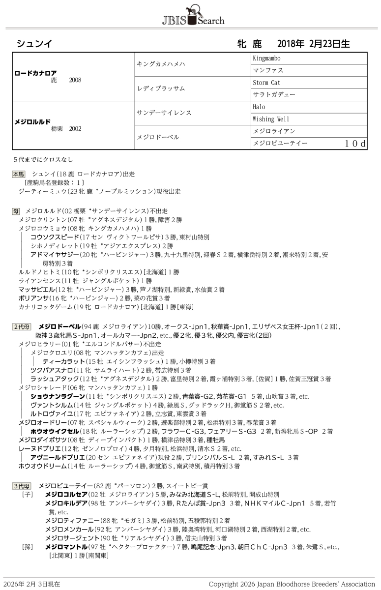 シュンイ Shuni 牝 鹿毛 2018年2月23日生 8歳