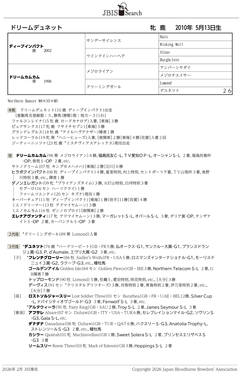| 父:ディープインパクト 母:ドリームカムカム 母の父:メジロライアン