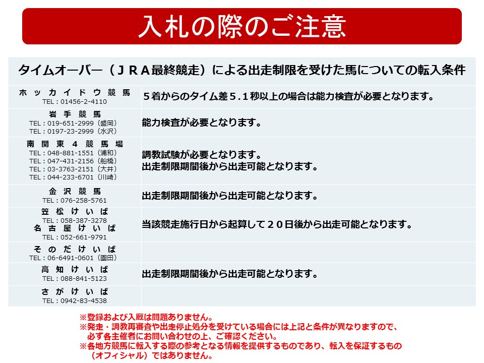 転入先の競馬場によって、能力検査・再調教試験を課されますので、必ず各主催者にお問い合わせの上、ご確認ください。