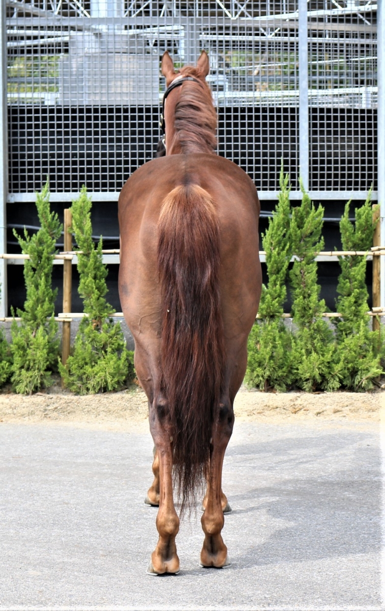 前走後、引き運動中に歩様の違和感(時折つまずく)があったことからレントゲン検査をおこなったところ、右前脚第三手根骨に全治6ヵ月の骨折を発症していることが判明。関係者で協議した結果、ファンドを解散してサラブレッドオークションへ出品の運びとなった次第です。