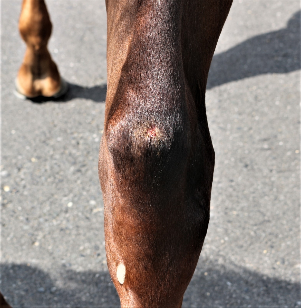 なお現在、両前脚のヒザに若干の熱感があります。また、右トモの飛端に外傷が見られ、腫れ・熱感が若干あります。四肢に皮膚病も見られます。