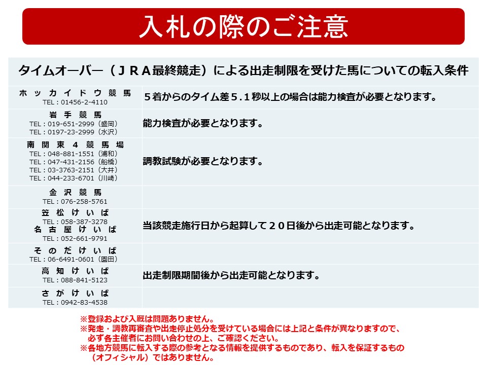 転入先の競馬場によって、能力検査・再調教試験を課されますので、必ず各主催者にお問い合わせの上、ご確認ください。