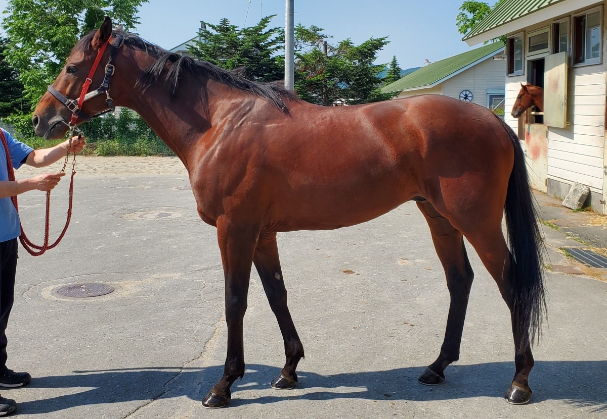 前走後に左前脚が少し腫れたので、念の為エコー検査をしたところ、12%という診断を受け、オークション出品に至りました。現在、熱感が少しありますが、痛みや歩様には出ていません。水冷にて対処しています。能力が非常に高い馬で、長距離の重賞戦線で良いところがあると思っていた馬。脚元が治れば間違いなく活躍できる馬でしたので、正直なところ、後ろ髪を引かれる思いです。(盛岡競馬・飯田弘道調教師)