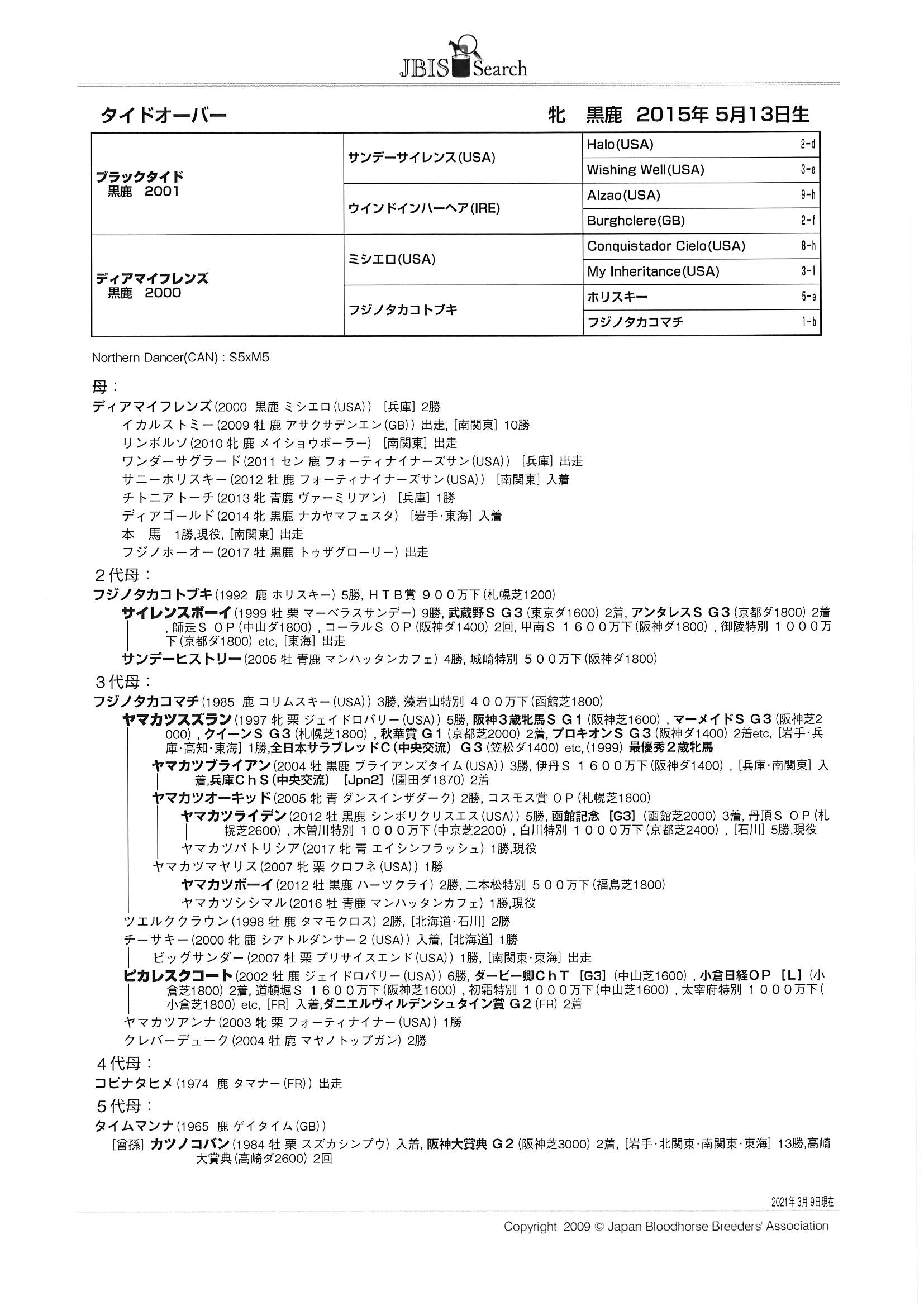 | 父:ブラックタイド 母:ディアマイフレンズ 母の父:ミシエロ