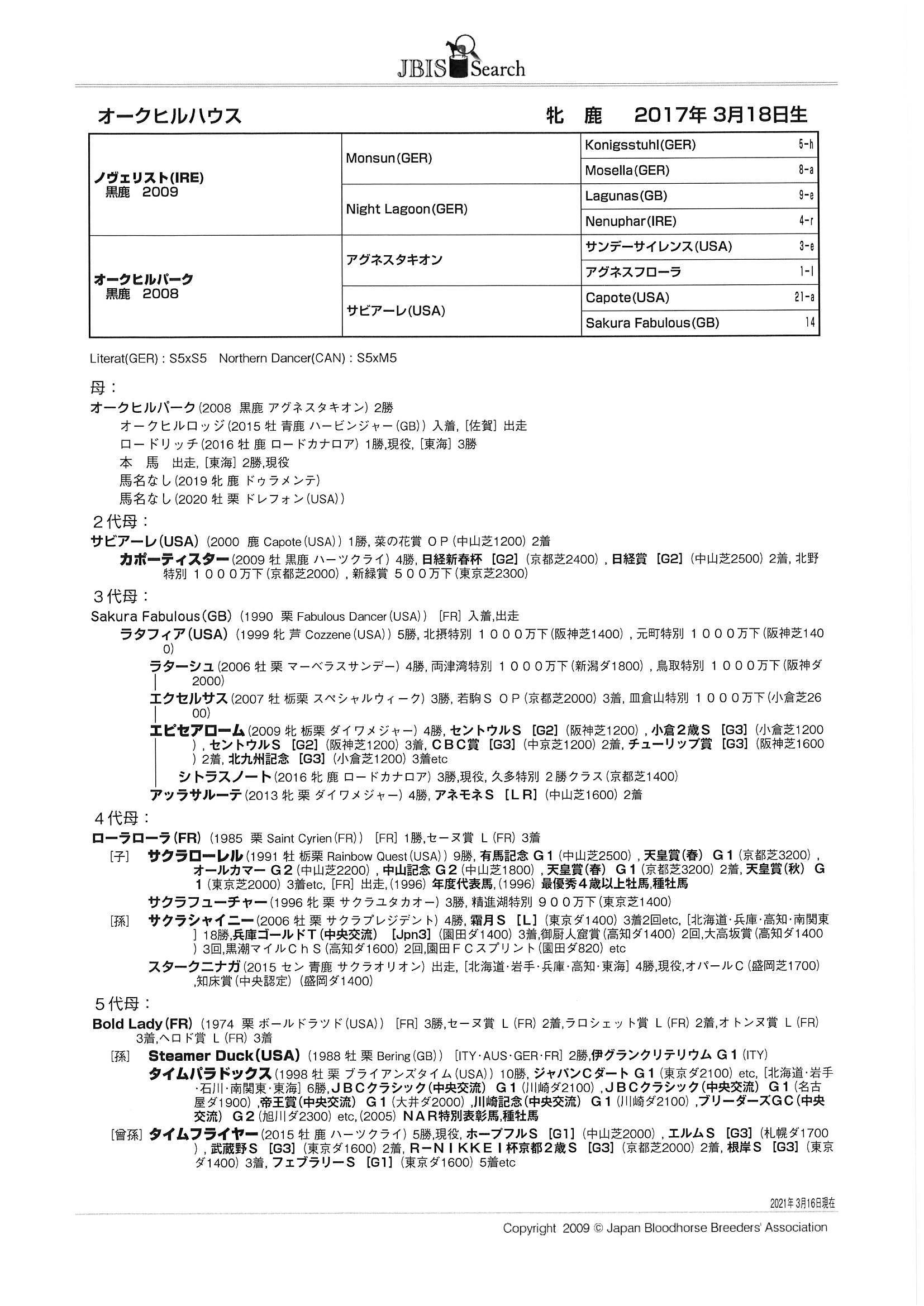 | 父:ノヴェリスト 母:オークヒルパーク 母の父:アグネスタキオン