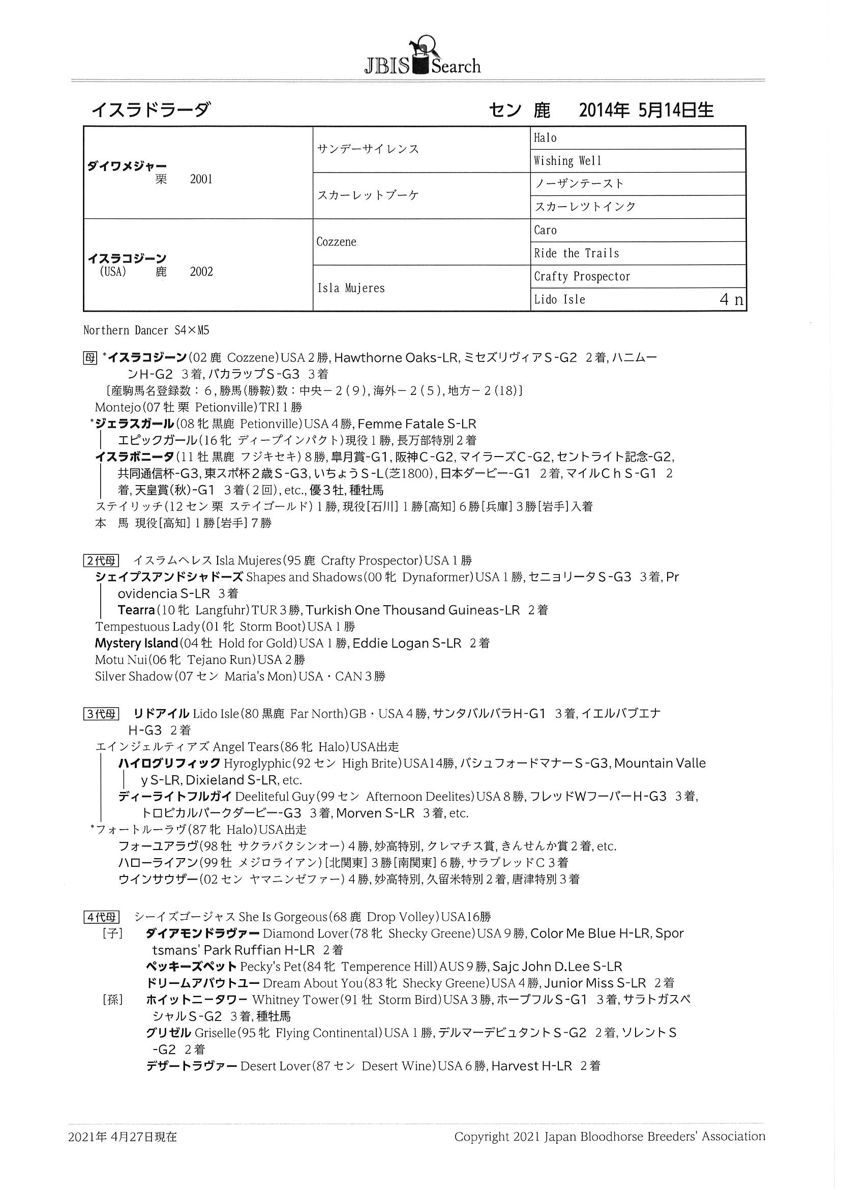 一方の母系は、半兄に皐月賞など重賞6勝を挙げたイスラボニータ(日本ダービー2着、マイルCS2着、天皇賞・秋3着)がいる良血ファミリー。曾祖母は米G1サンタバルバラH3着のLido Isle、母はホーソーンオークスの勝ち馬で重賞でも善戦を続けたイスラコジーンとバックボーンは整っており、おばにShapes and Shadows(セニョリータS3着)、近親にHyroglyphic(バシュフォードマナーS)やDeeliteful Guy(フレッドWフーパーH3着、トロピカルパークダービー3着)、フォーユアラヴ(中央4勝、妙高特別、クレマチス賞)など、やはり活況を呈しています。