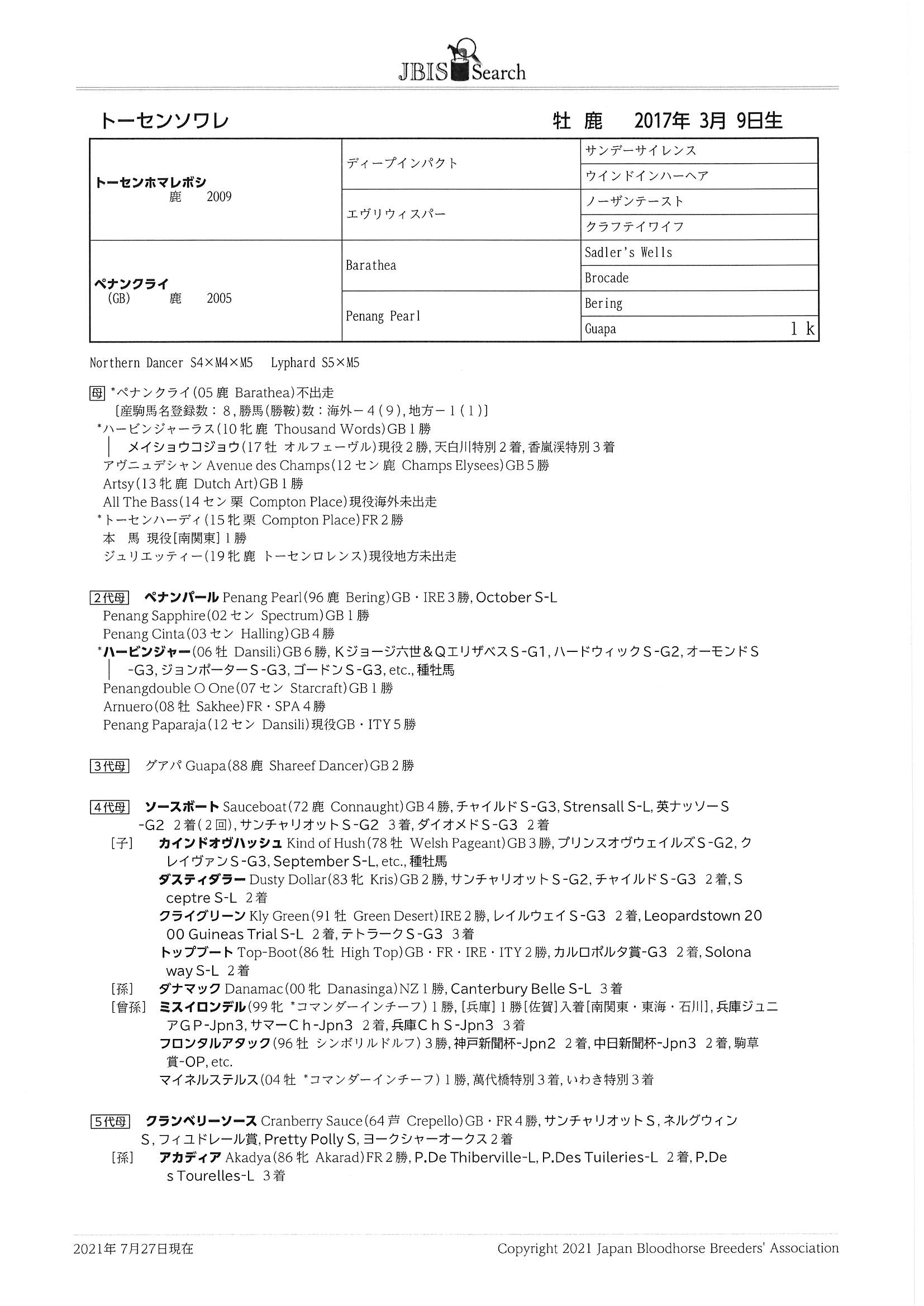 | 父:トーセンホマレボシ 母:ペナンクライ 母の父:Barathea