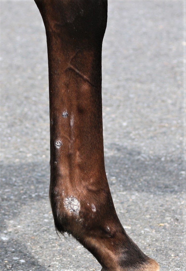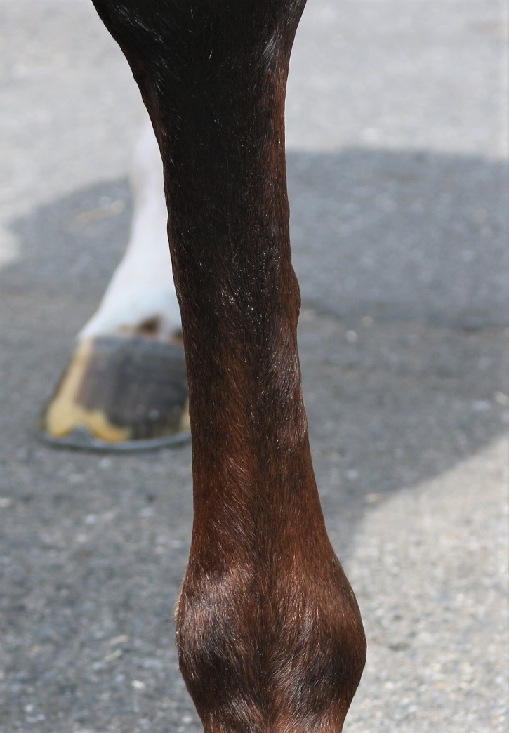 なお、両前肢(特に左前)に真菌が見られます。左前肢の管骨の内外と右前肢管骨内側に骨瘤を発症していますが、痛みはありません。両前蹄をラバー鉄で装蹄しています。