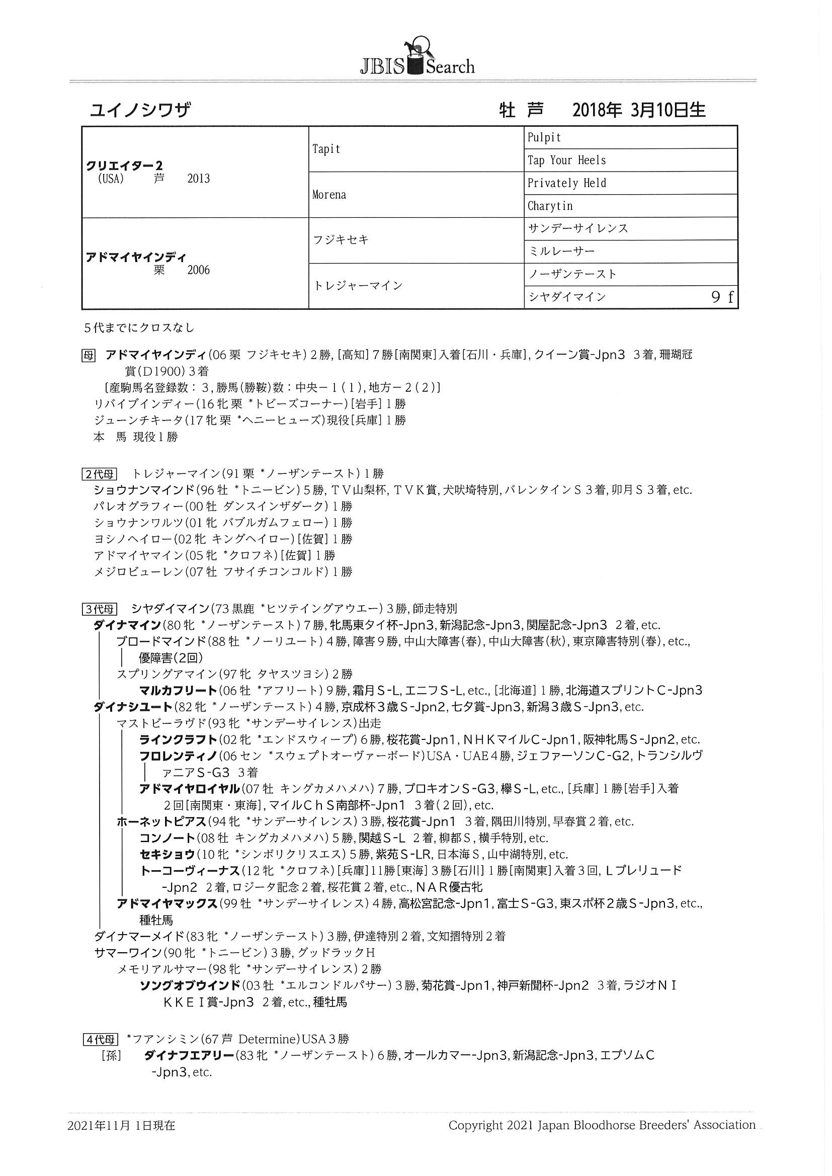 | 父:クリエイター2 母:アドマイヤインディ 母の父:フジキセキ
