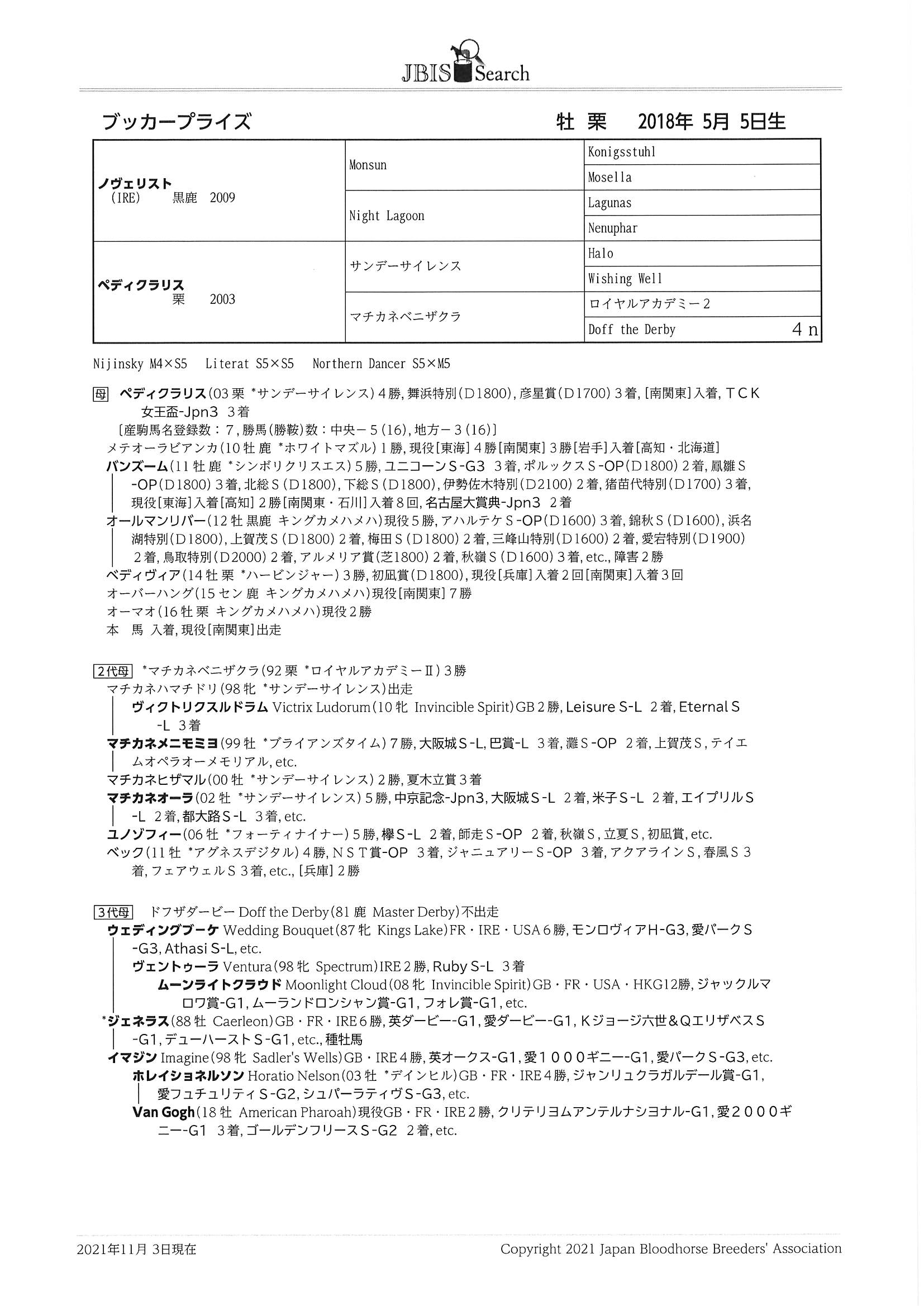 | 父:ノヴェリスト 母:ペディクラリス 母の父:サンデーサイレンス