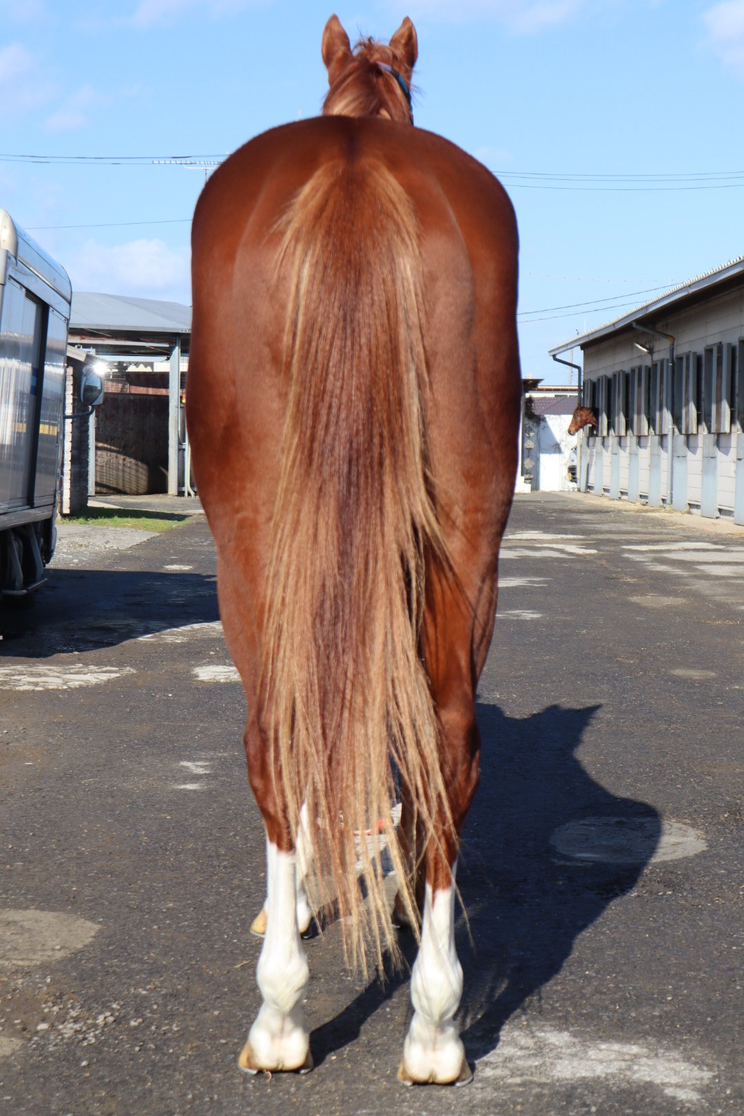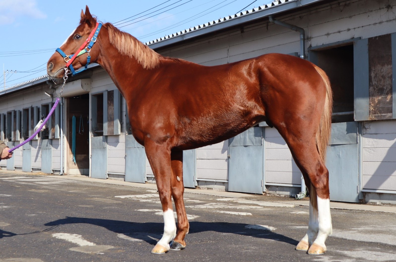 キャリア2戦でのオークション出品となりましたが、480kgを超える馬格の持ち主で、見栄えのいい馬。まだ精神的に幼さが目立ちますし、競馬を理解できていないような面も見られるので、あらゆる面でこれからの馬と言えるでしょう。