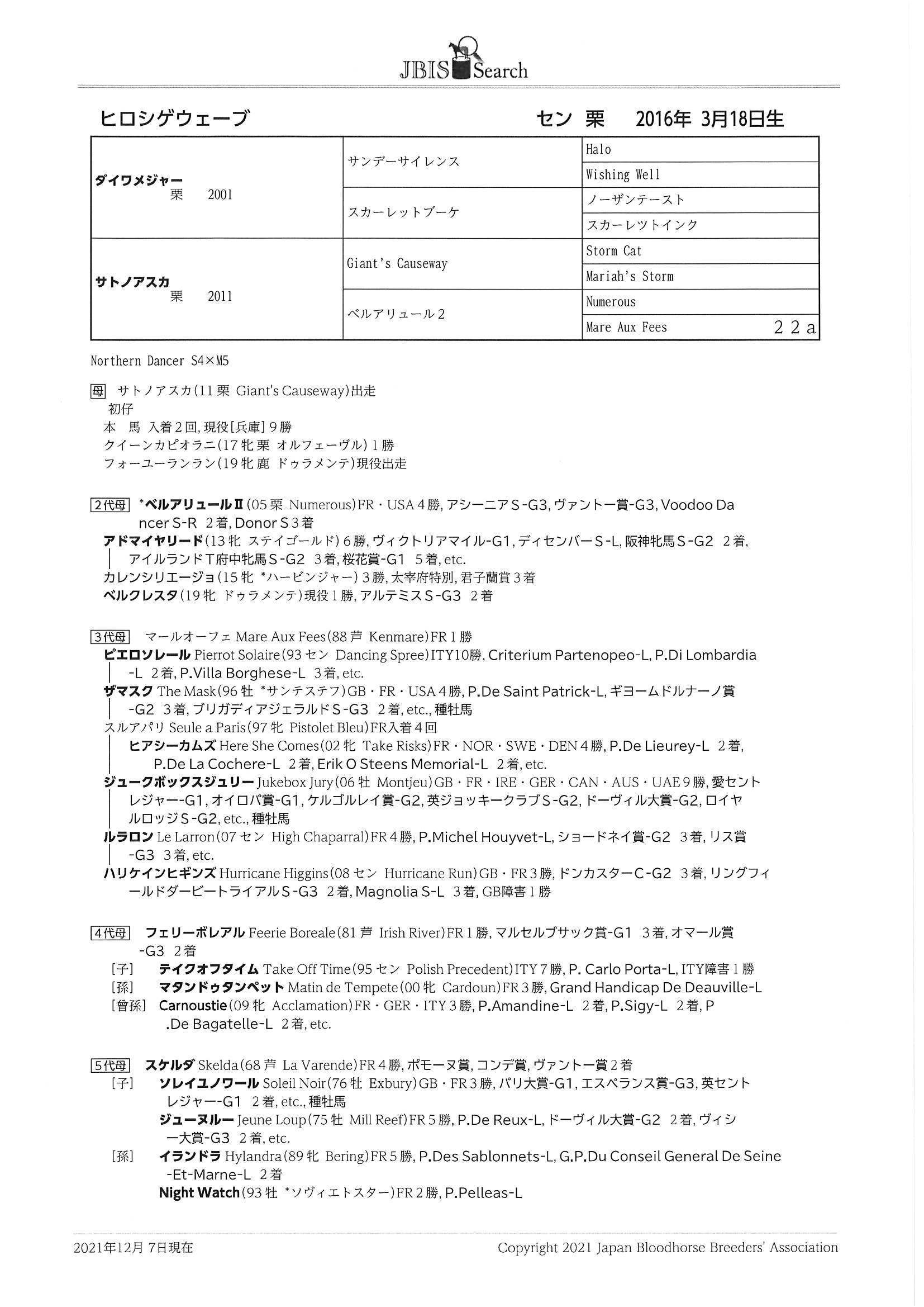 | 父:ダイワメジャー 母:サトノアスカ 母の父:Giant's Causeway