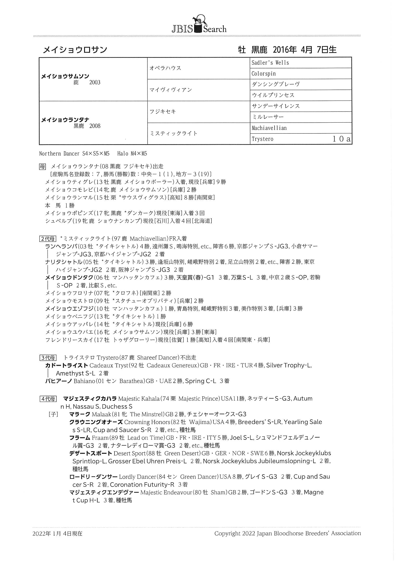 母系を見ますと、半兄メイショウティグレが園田で9勝、メイショウランマルは高知で8勝。全姉のメイショウコモレビは園田で2勝を挙げています。伯父のランヘランバ、ナリタシャトルは障害重賞の活躍馬で、メイショウドンタクは天皇賞・春で3着に入りました。4代母Majestic Kahalaは米G3ネッティーSの勝ち馬で、その子孫には欧米の重賞好走馬が多数。さらに溯ると、一族からは米G3ディスプレイH勝ちのIn the Ruffや、G3カナディアンダービー勝ちのFootprint、G1スピナウェイS2着のA to the Croftなども出ています。