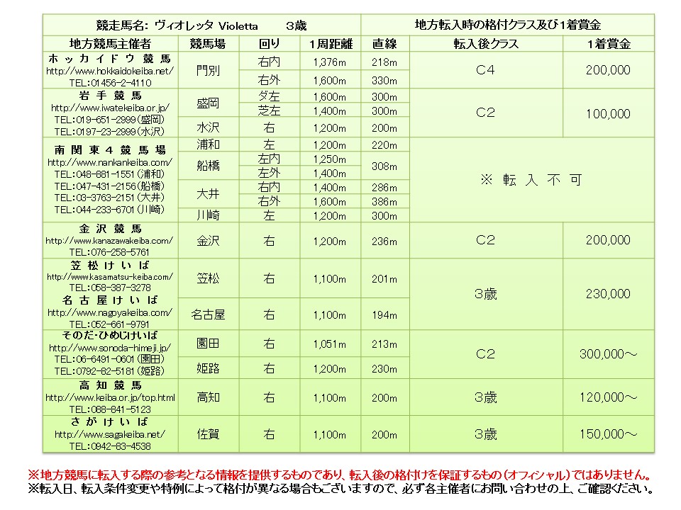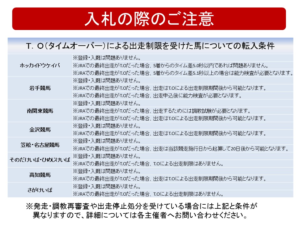 転入先の競馬場によって、能力検査・再調教試験を課されますので、必ず各主催者にお問い合わせの上、ご確認ください。