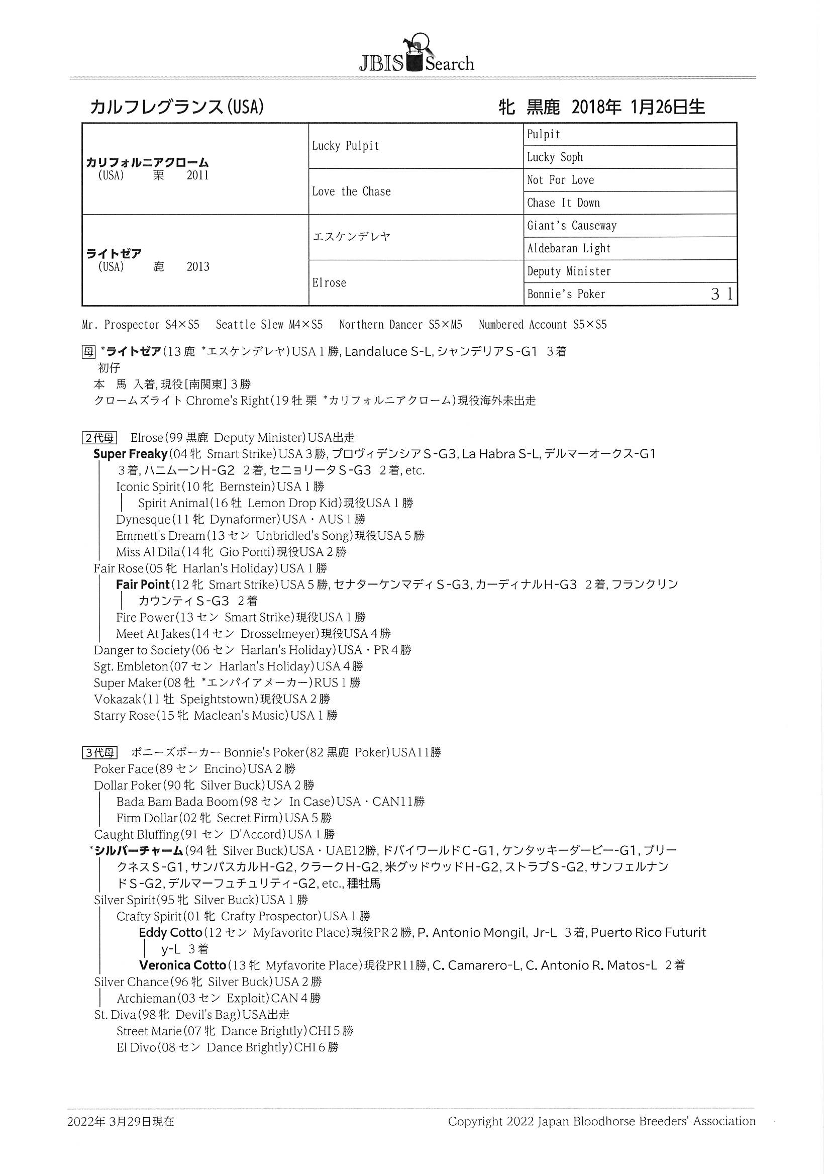 父カリフォルニアクロームは、Pulpitの仔Lucky Pulpitを父に、Not For Loveを母の父に持つ米国産馬。3歳時の2014年にはケンタッキーダービー、プリークネスS、サンタアニタダービー、ハリウッドダービーと4つのG1を制して、米年度代表馬と3歳牡馬チャンピオンに選出。5歳時の2016年にはレコード勝ちとなったドバイワールドCをはじめ、オーサムアゲインS、パシフィッククラシックとさらに3つのG1勝ちを積み上げ、自身2度目となる米年度代表馬、そして古牡馬チャンピオンの座に輝きました。現役引退後は2017年から米国とチリで種牡馬入り。すでに米重賞馬を複数誕生させており、2020年からは日本にて種牡馬生活をスタート。本邦1、2年目ともに140頭を超える種付けオファーを集め、人気を博しています。父同様、その産駒には芝・ダートを問わず、他を圧倒するパフォーマンスを期待しても良さそうです。
