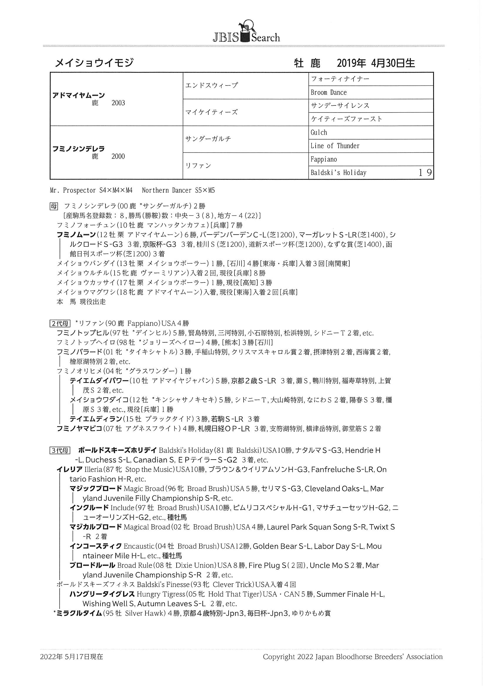 一方、母系を見ますと、母フミノシンデレラは中央のダート短距離で2勝。全兄フミノムーンはOP特別2勝を含む6勝を挙げ、京阪杯、シルクロードSで3着となるなど重賞でも活躍しました。その他の兄姉は地方競馬で多くの白星を挙げています。近親にも京都2歳S3着のテイエムダイパワーなどOPでの活躍馬が多く、曾祖母Baldski's Holidayは米G3ナタルマSの勝ち馬。その息子のミラクルタイムは外国産馬として日本で走り、京都4歳特別、毎日杯と重賞を2勝しています。他にも一族には米G1ピムリコスペシャルH勝ちのIncludeを筆頭に多数の活躍馬が出ており、スピードとパワーに優れた牝系となっています。