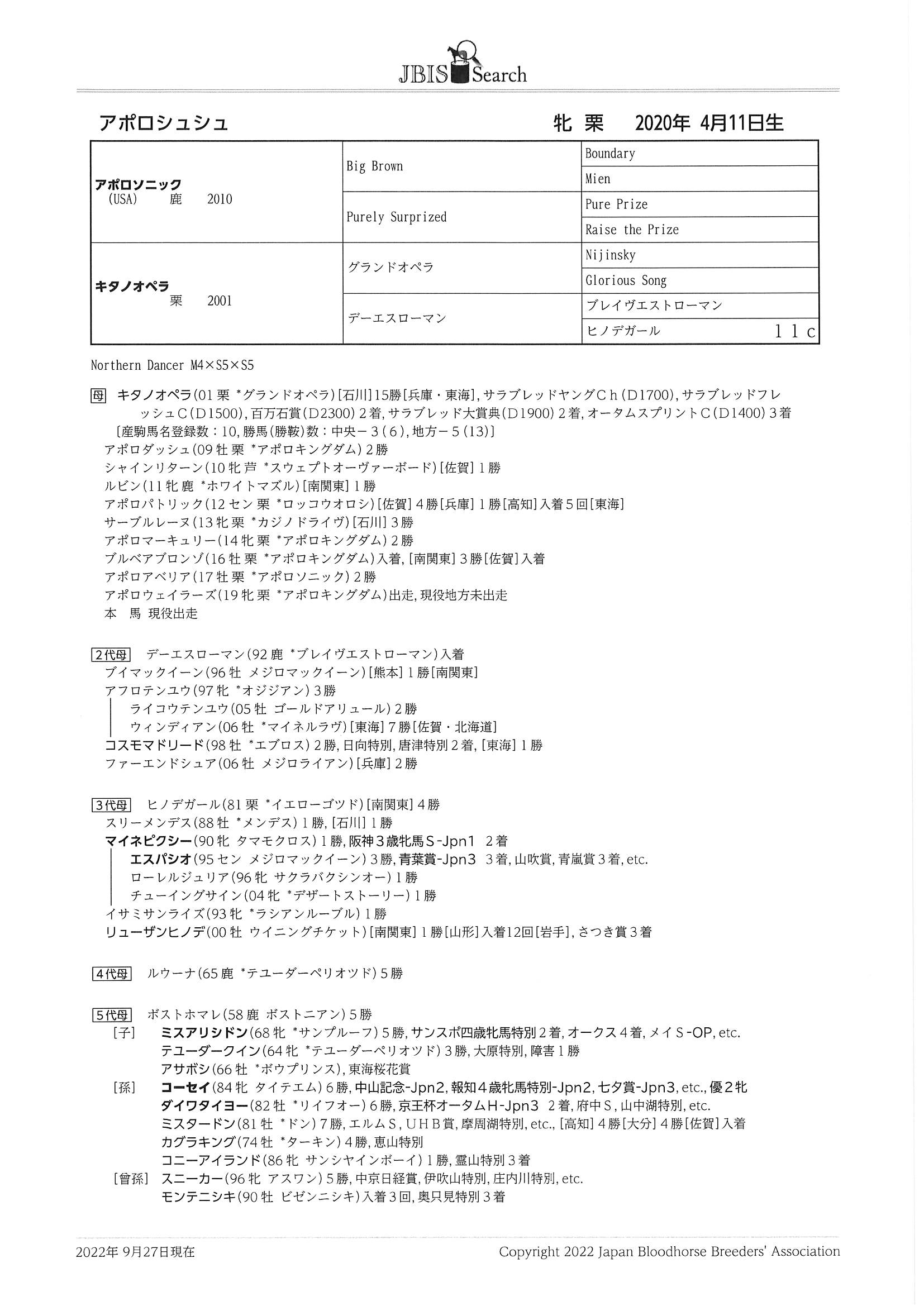 父アポロソニックは、産駒の数が少ないながら、8連勝で先日の西日本ダービーを制したスーパーバンタムを輩出。また、母のキタノオペラは金沢の重賞を含め15勝を挙げた活躍馬で、更に本馬の兄アポロダッシュ、姉アポロマーキュリー、そして全兄となるアポロアベリアの3頭がそれぞれJRAで2勝をマークしている事から、血統的な魅力も充分あるものと思われます。
