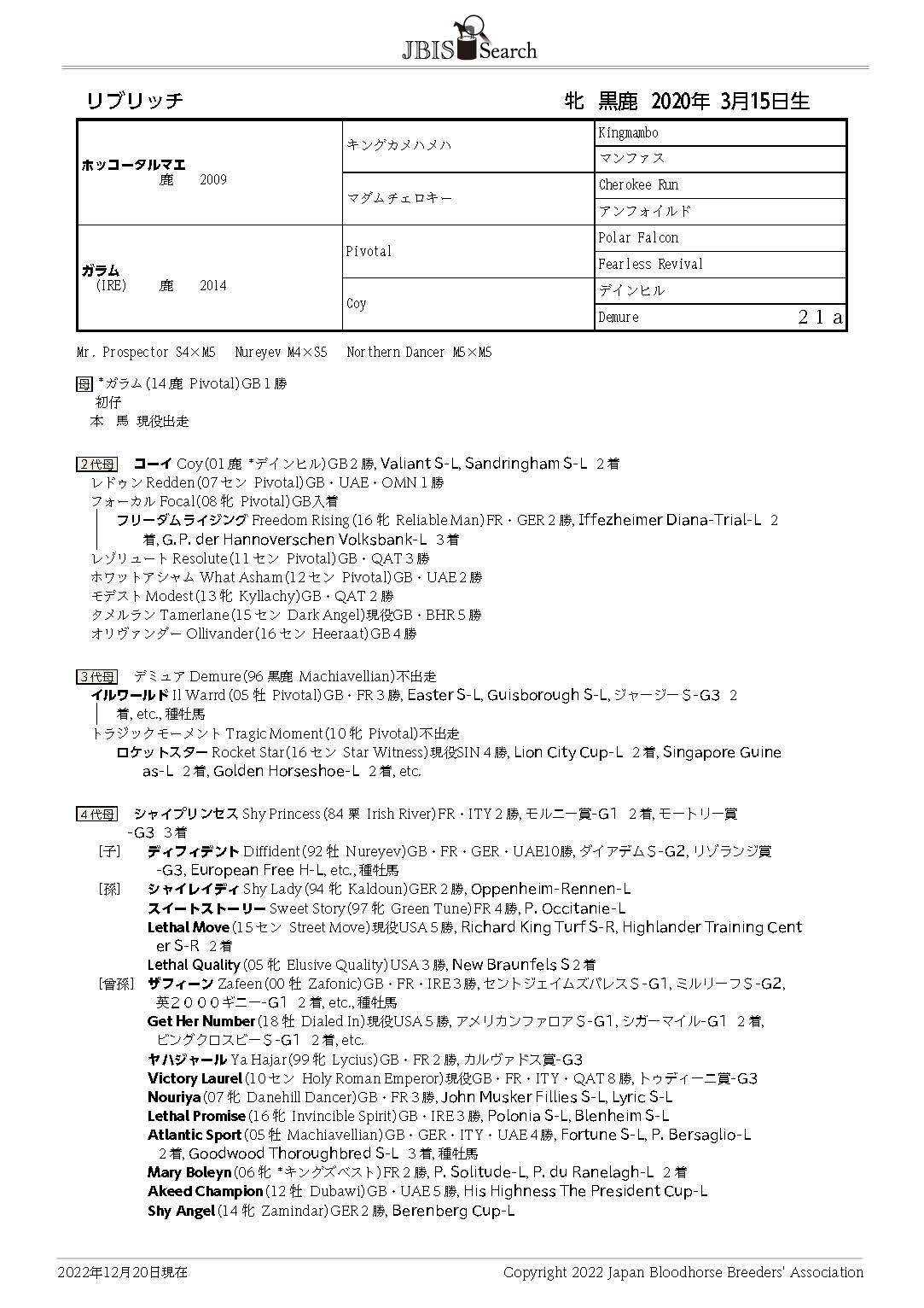 母系を見ますと、母ガラムは英国で1勝。いとこにはドイツのリステッドレースで好走したフリーダムライジングがいます。祖母コーイは英国のリステッドレース好走馬で、その半弟イルワールドは英G3ジャージーS2着で種牡馬入りも果たしています。3代母デミュアは不出走ですが、その半兄ディフィデントは英G2ダイアデムSなどを勝って種牡馬入り。4代母シャイプリンセスは仏G1モルニー賞の2着馬で、その子孫には英G1セントジェイムズパレスSを勝ち、英2000ギニー2着の種牡馬ザフィーンや、米G1アメリカンファラオSなどを勝ったゲットハーナンバーなどがいます。